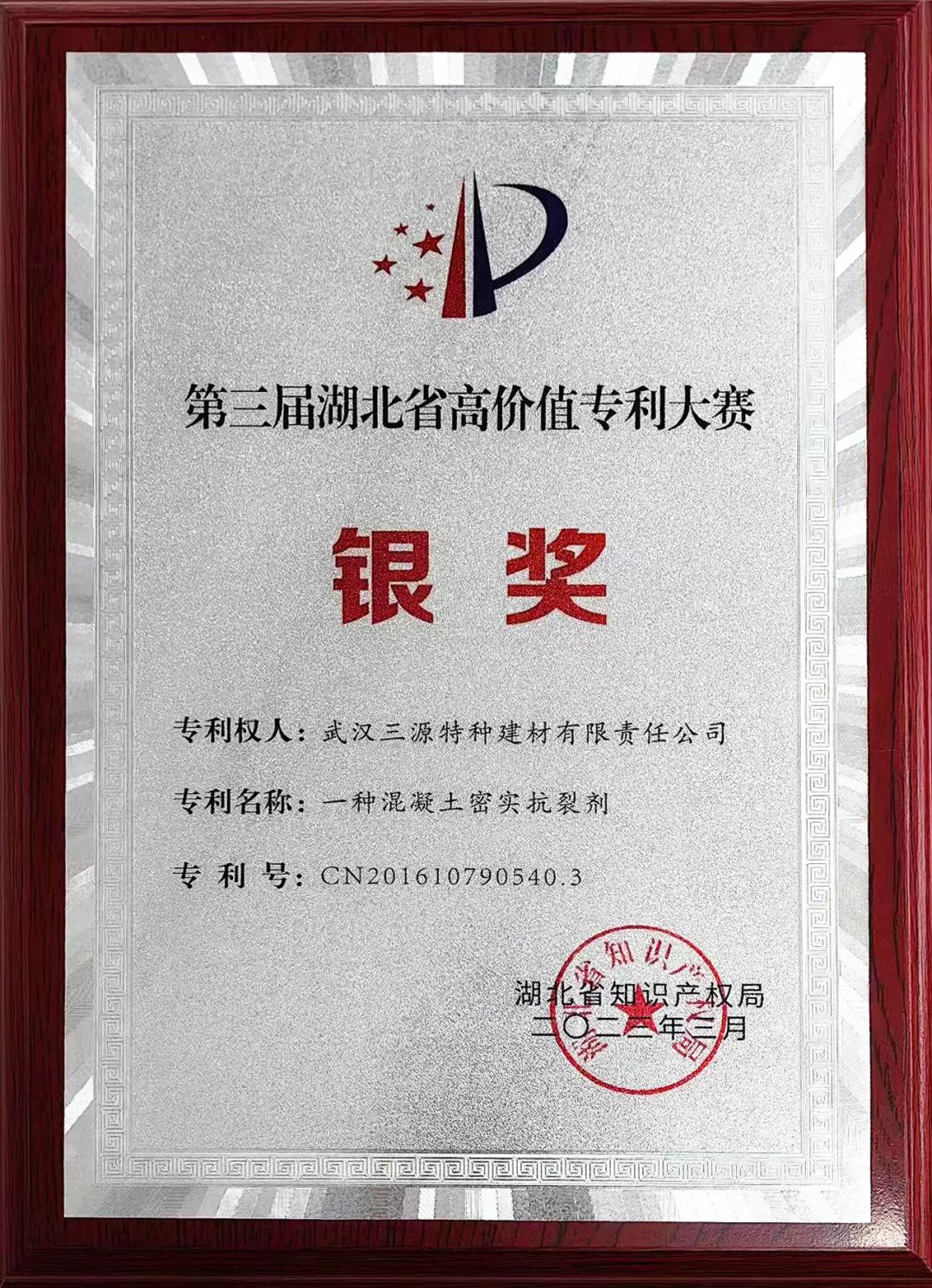 3月3日,第三屆湖北省高價值專利大賽頒獎暨獲獎專利轉(zhuǎn)化對接活動在武漢成功舉辦。本次大賽由湖北省知識產(chǎn)權(quán)局主辦,頒發(fā)了金獎、銀獎、優(yōu)秀獎共99個。武漢三源特種建材有限公司憑借發(fā)明專利“一種混凝土密實(shí)抗裂劑”榮膺湖北省高價值專利大賽銀獎。