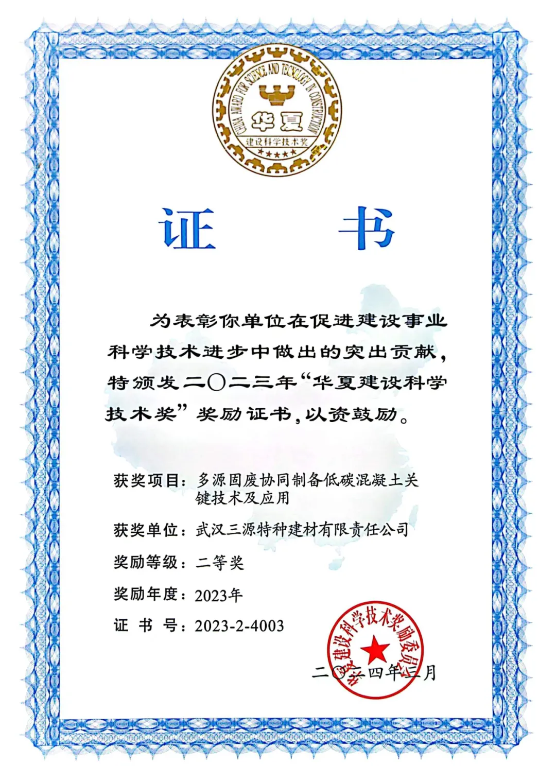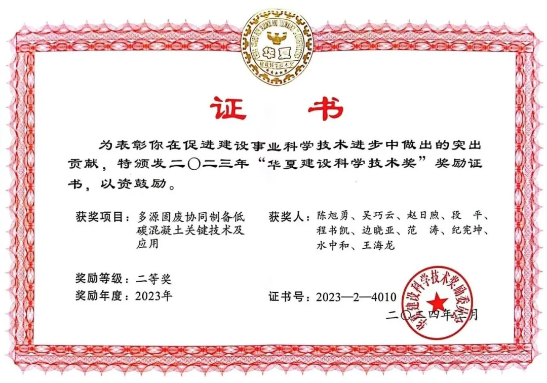 近日,住房和城鄉(xiāng)建設(shè)部華夏建設(shè)科學技術(shù)獎勵委員會發(fā)布“2023年度華夏建設(shè)科學技術(shù)獎”授獎公告,由武漢工程大學牽頭,武漢三源等多單位參與完成的《多源固廢協(xié)同制備低碳混凝土關(guān)鍵技術(shù)及應(yīng)用》項目成果喜獲華夏建設(shè)科學技術(shù)獎二等獎。