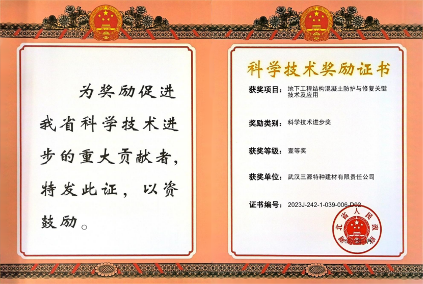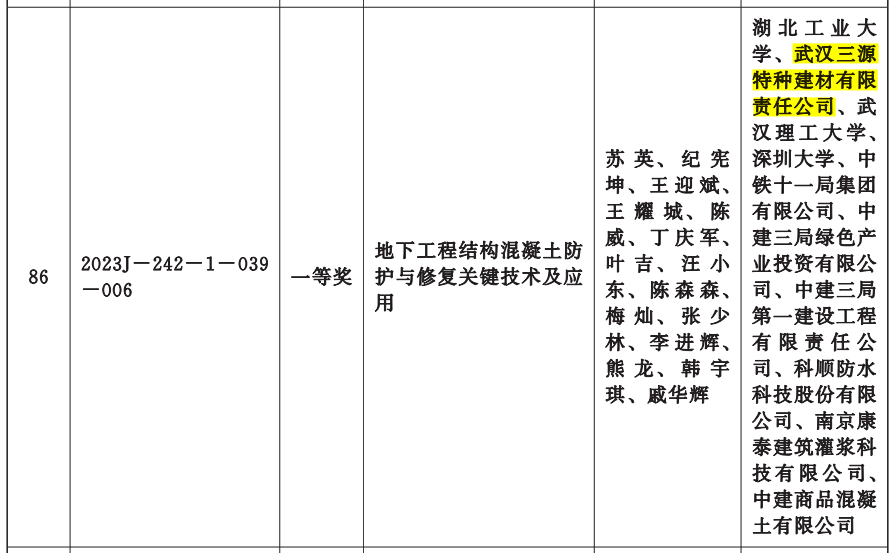 由武漢三源特種建材有限責(zé)任公司與湖北工業(yè)大學(xué)合作的“地下工程結(jié)構(gòu)混凝土防護(hù)與修復(fù)關(guān)鍵技術(shù)及應(yīng)用”科研成果,榮膺“湖北省科技進(jìn)步一等獎(jiǎng)”!